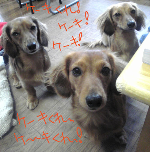 風邪気味の父が今朝食べてたら、おこぼれをまたガン見で待つわんこーず。